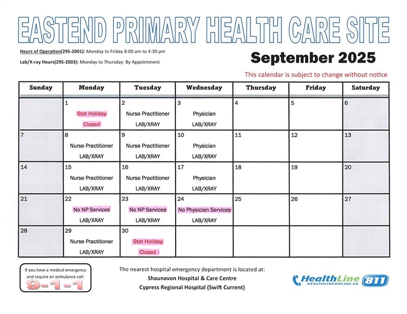 Eastend Primary Health Care Calendar: September 2025