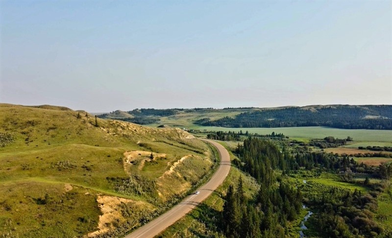 A green interpretative sign that tells about the area is located on the right side of the road. This interesting geological feature is basically an imaginary line that extends to Chimney Coulee and divides which way the local waters flow. North of the line, the creeks and rivers flow northeast to Hudson Bay, which is around 1800 kilometers away. Creeks and rivers found to the south of the line flow roughly 2768 kilometers south to the Gulf of Mexico. It’s quite similar to the Continental Divide found in the mountains, which divides waters that flow east/west, but is on a much smaller scale.