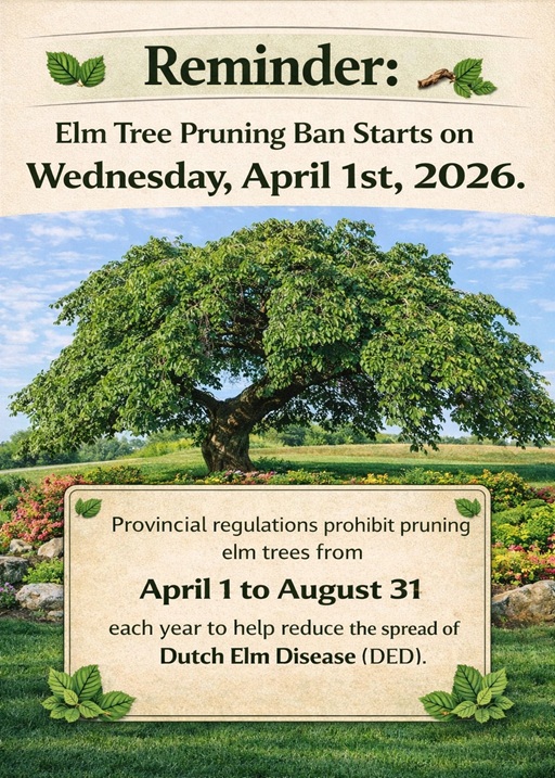 Provincial regulations prohibit pruning elm trees from April 1 to August 31 each year to reduce the risk of spreading Dutch Elm Disease (DED).